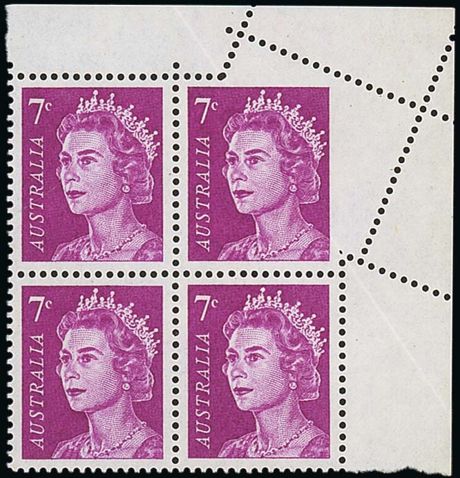 7c. magenta, a top left corner block of eight (4x2) and a single showing double perforations (affects six stamps in block), and a top right corner block of four imperforate at top right due to paper fold, fine unmounted mint. S.G. 388a; BW 447bb, 447be, $1170. Photo for corner block