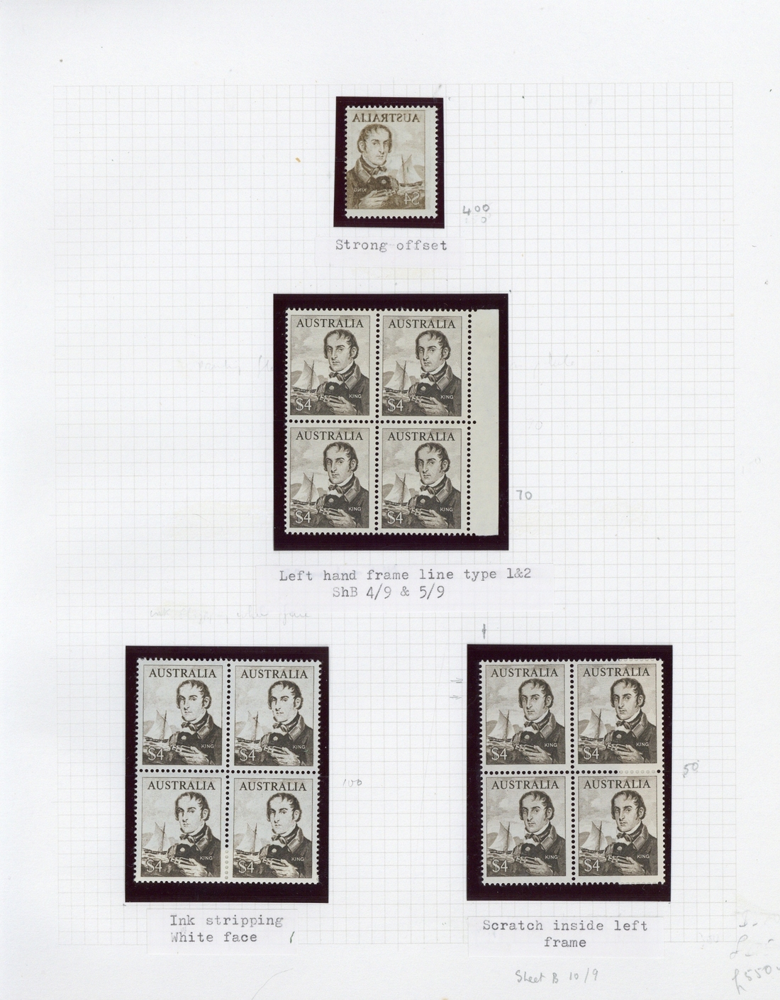 1966-73 Navigators, a mint study including 75c. to $2 overprinted "specimen" including both lengths on 75c. and $1, 40c. with misplaced perforations, 50c. with offset, 75c. top centre block of ten with plate number "3" and corner blocks of four from right pane (2) showing re-cutting at base, $1 marginal vertical pairs (4, one with left frame missing and the others retouched), bottom centre block of four with Plate number "3", lower left corners block of four (2) with recut between sails and eye and State II with plate fracture, and perf 15x14 top centre block of four with Plate number "3", and $4 single with offset and a marginal block of four and two marginal pairs showing both types of scratches outside left frame. A fine lot with most unmounted. S.G. 398-403; BW 460-466