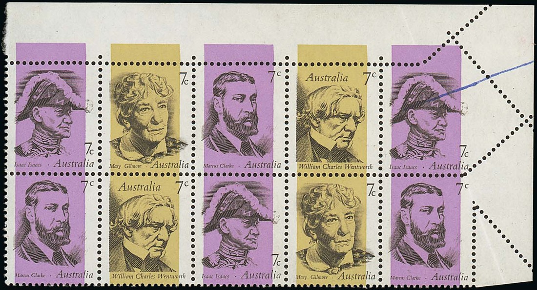 1973 (May) Famous Australians 7c. top right corner se-tenant block of ten (5x2), variety imperforate at top and right due to paper fold, the error crossed through by ink stroke, fine unmounted mint. The only recorded example. S.G. 537a; BW 628b, $1000. Photo