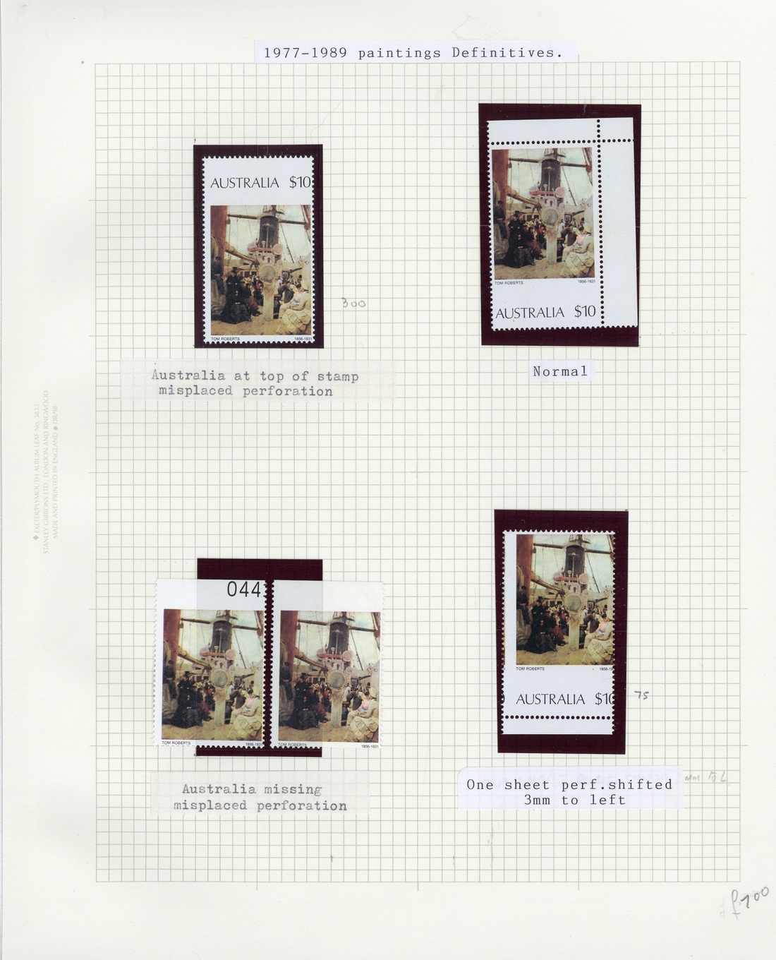 $10, four examples with misplaced perforations, two with "australia $10" omitted (one showing part serial number), one with "australia $10" at top, and a marginal example showing perforations misplaced to left, fine unmounted mint. S.G. 567a; BW 784b, 784ba, 784bb; $775