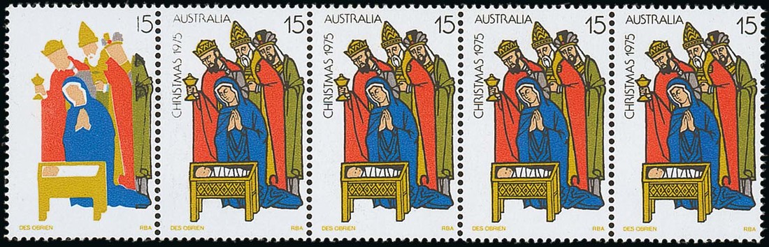 1975 (Oct.) Christmas 15c. horizontal strip of five, the first stamp with black largely omitted, fine unmounted mint. S.G. 612; BW 730cb, $1750. Photo