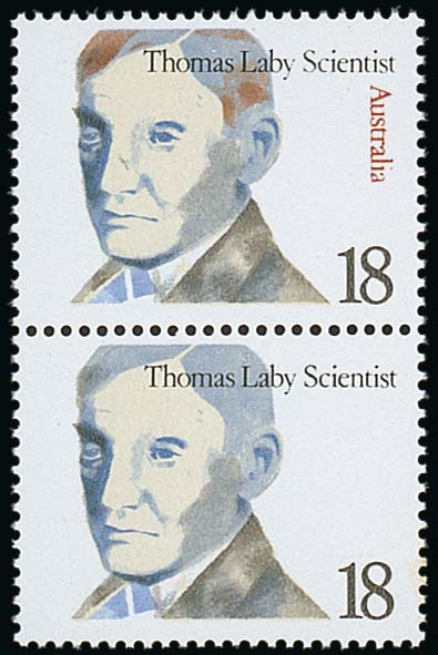 1976 (Nov.) Famous Australians 18c. (Thomas Laby) vertical pair, the lower stamp with red-brown ("Australia etc.) omitted", fine unmounted mint. S.G. 638a, £850; BW 758c, $1250. Photo