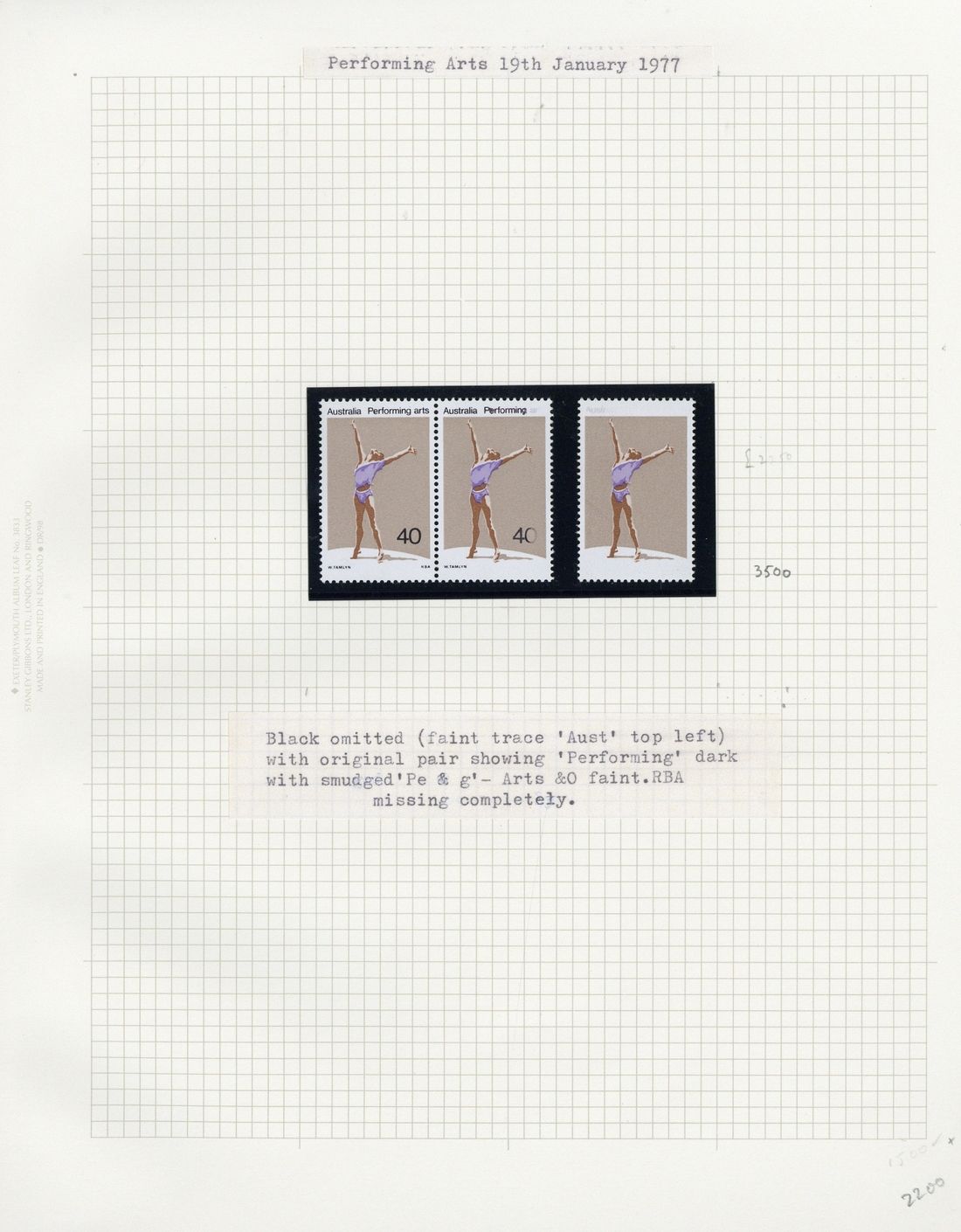 1977 (Jan.) Performing Arts 20c. vertical strip of five with margins at ends, the bottom stamp with grey partly omitted, 30c. lower left corner pair, the right stamp with black large part omitted and the adjoining stamp partially, and 40c. with black almost completely omitted; fine unmounted mint.