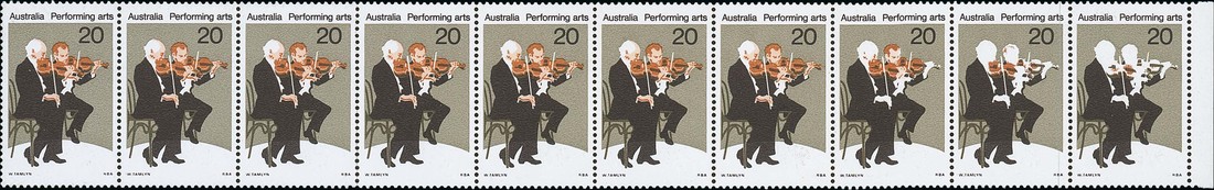 1977 (Jan.) Performing Arts 20c. horizontal strip of ten with margin at right, the tenth stamp with chestnut virtually omitted, the ninth stamp less affected and the eighth stamp showing only minor omisson, fine unmounted mint. S.G. 641; BW 761ca, $2250. Photo