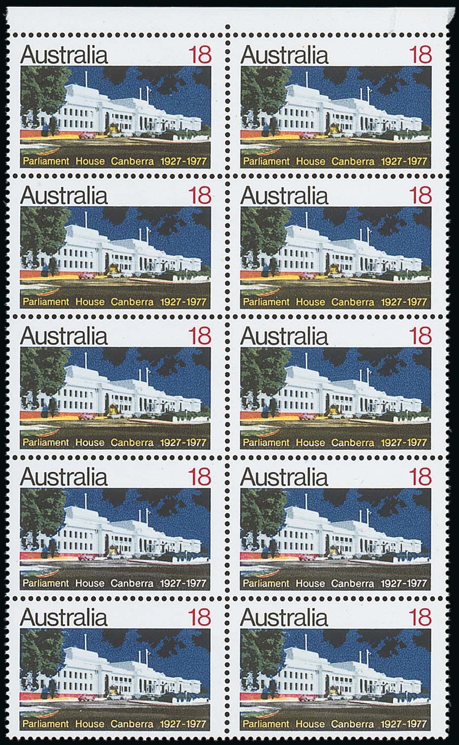 1977 (Apr.) Canberra 18c. block of ten (2x5) with margin at top, the fourth row with yellow virtually omitted, the third row affected to a minor degree and the fifth with a partial omission, fine unmounted mint. S.G. 653; BW 773cb, $4000. Photo