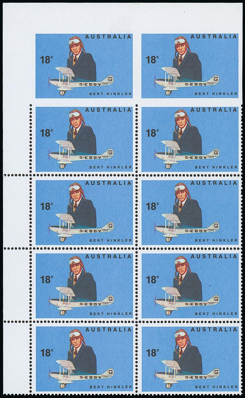 18c. Hinkler, a top left corner block of ten (2x5), variety the top row imperforate, fine unmounted mint. S.G. 659; BW 791ba, $2000. Photo
