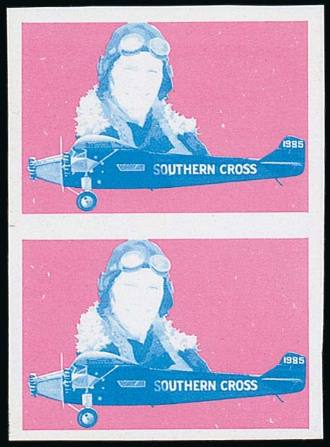 18c. Kingsford Smith, imperforate vertical plate proofs of cyan plate with magenta background and magenta and cyan plates, both on gummed stamp paper, fine. BW 792PP(1), 792PP(2), $1200. Photo