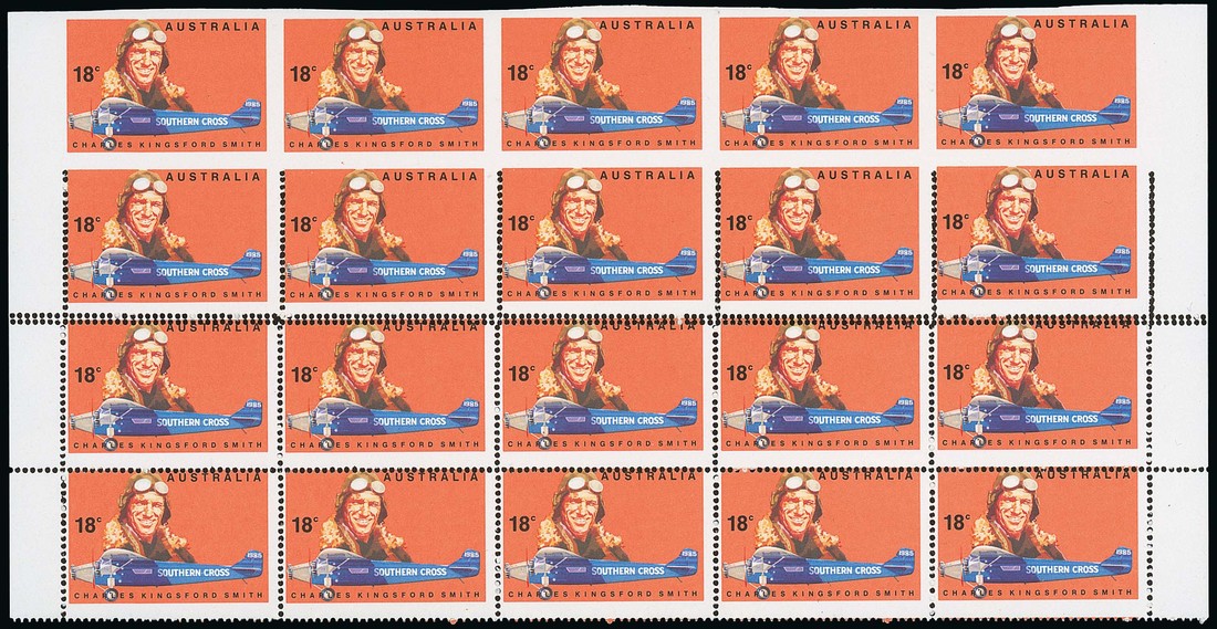 18c. Kingsford Smith block of twenty (5x4) with margins at sides, the top row imperforate and double perforations between second and third rows; also a marginal imperforate pair. Fine unmounted mint. S.G. 660; BW 792. Photo
