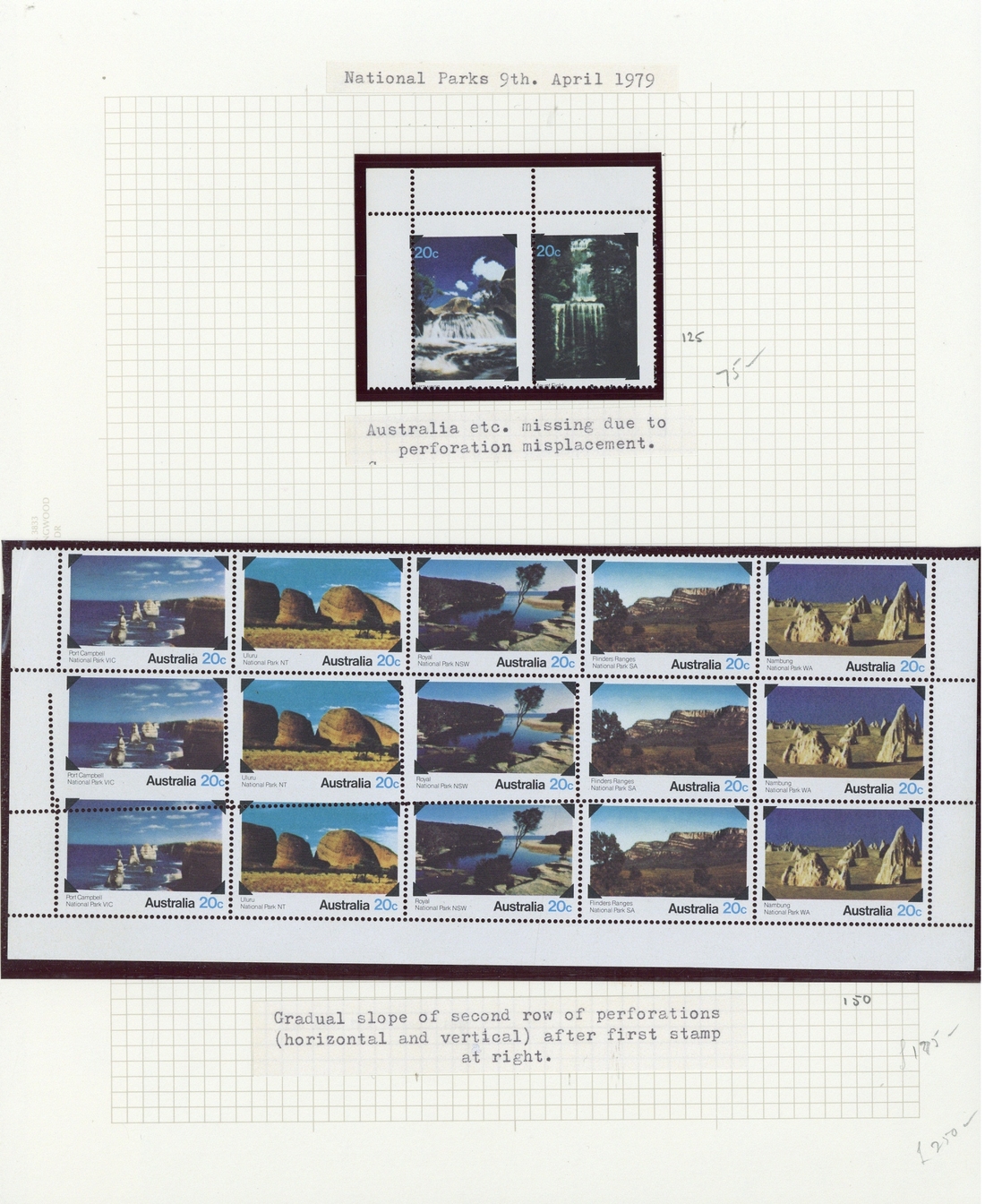 1979 (Apr.) National Parks 20c. (Girraween and Mount Field se-tenant), a gutter strip of four with margin at top showing grossly misplaced vertical perforations, a top left corner pair with misplaced horizontal and vertical perforations resulting in "Australia" and inscription virtually missing, and 20c. se-tenant strip of five block of fifteen being the bottom three rows of the sheet with the ninth row showing misplaced perforations due to slippage, fine unmounted mint. BW 841ba, 843bb, $400+