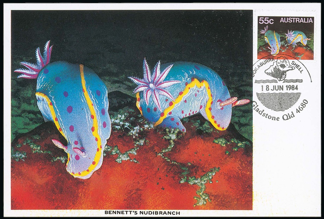 1984-86 Marine Life 55c. with new blue (bennett's nudibranch") omitted used on maximum card, the only way it exists of which less than ten have been recorded, fine. With normal for comparison. S.G. 930a, £1500; BW 1053c, $2500. Photo