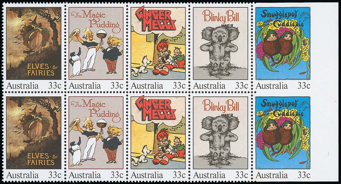 1985 (July) Classic Australian Children's Books, 33c. block of ten (5x2) with margin at right comprising two se-tenant strips, the right stamp (Snugglepot) imperforate on three sides, fine unmounted mint. S.G. 982a; BW 1111b, $1500. Photo