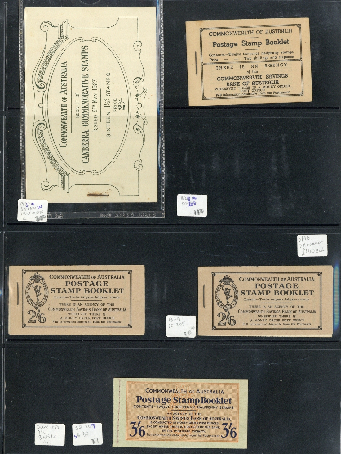 1927-89 range in a four-ring binder including 1927 Canberra 2/-, 1942 (Aug.) 2/6d., 1949 (Sept.) 2/6d. (2), 1952 (June) 3/6d., 1953 (July) 3/6d. with waxed interleaves, 1956 (July) 3/6d. with waxed interleaves, 1959 (Mar.) 4/- with waxed interleaves, 1960 (Mar.) 5/- with waxed interleaves, 1963 5/- with waxed interleaves, 1964 (June) 5/- with waxed interleaves, 1965 (July) 5/- (2) and 1966 (Feb.) 60c., also a few loose panes, fine. Cat. £1250+