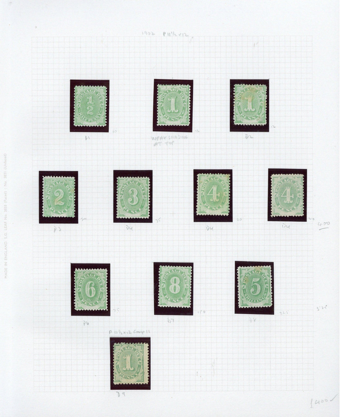 1902 (July) perf 11½, 12 ½d. (21 including a marginal block of twenty), 1d. (2, one with light stain), 2d. (light stain on reverse), 3d., 4d. (2, one with light stain on reverse, the other without gum), 6d., 8d. (5/- (light stains) and perf 11½, 12 compound with 11 1d. (no gum and lightly toned). S.G. D1-D9, £969