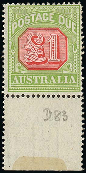 1913-23 perf 14 £1 scarlet and pale yellow-green, margin at foot,, some hinge remnants otherwise fine mint. S.G. D87, £950. Photo