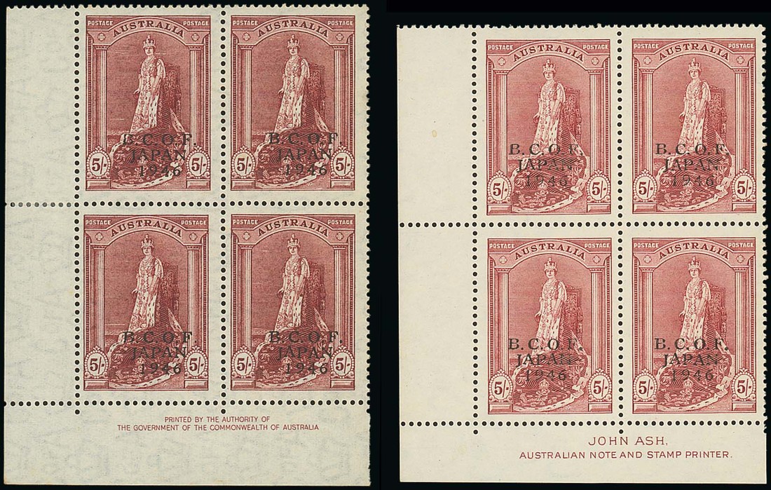 ½d. to 5/- (both) in imprint blocks of four (additional 1d., 3d., 6d. and 1/-) and singles (with additional 1d. with overprint in blue-black), fine mint. S.G. J1-J7a, £1796; BW J1-J8, $4000+. Photo for 5/- imprints