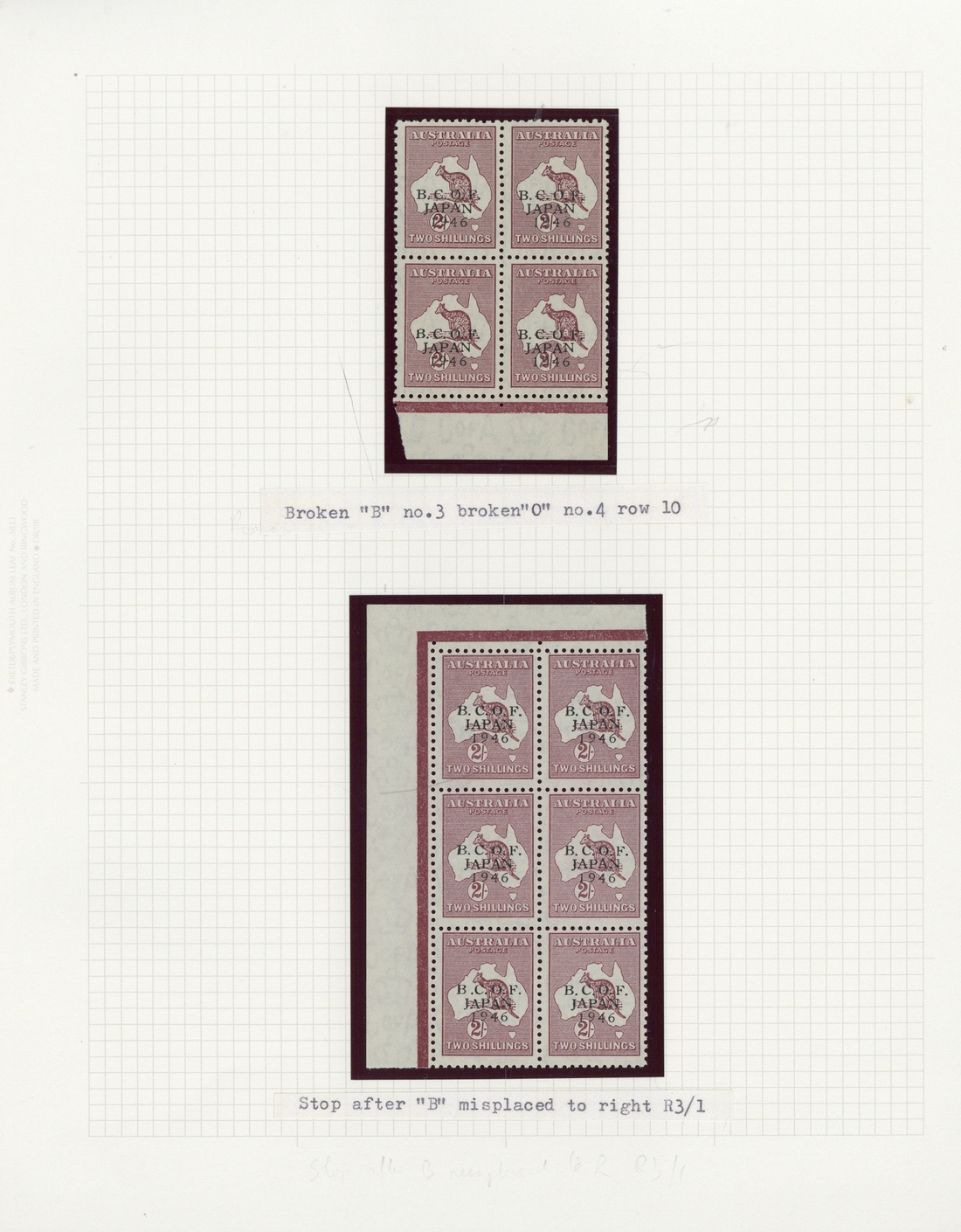½d. to 5/- predominantly mint study of the overprint comprising ½d. blocks of four (4) and singles (2, one on piece), 1d. with overprint misplaced to right (used), 3d. marginal pair, 6d. corner block of six and blocks of four (3), 1/- corner block of six, blocks of four (2), pair and singles (2), 2/- corner block of six, block of four strip of three, vertical pair and a single, and 5/- (3), fine. S.G. J1-J7, £2200+