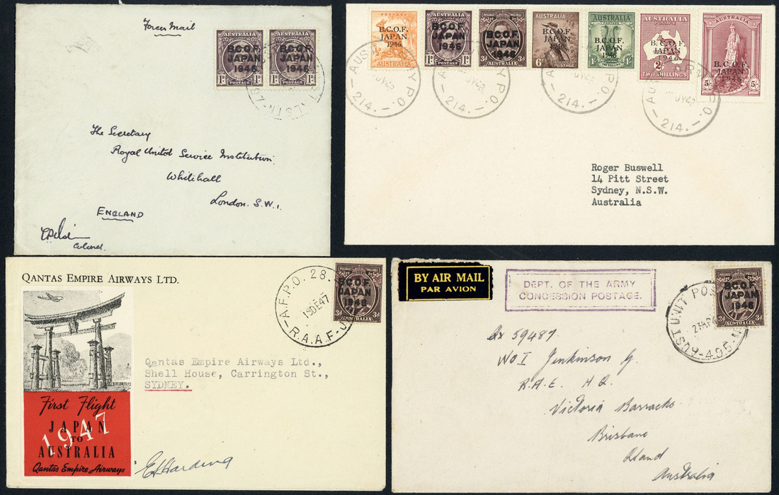 ½d. to 5/- (thick paper) on 1948 (July) envelope to Sydney; ½d. block of four on 1948 (May) envelope to England; 1d. pair on 1947 (Oct.) envelope to London; 1d. on 1948 (Dec.) envelope to Tasmania; 3d. on 1947 (Dec.) Qantas envelope to Sydney; 3d. on 1948 envelope to Brisbane; plus a piece bearing 3d., 6d. and 2/- pair