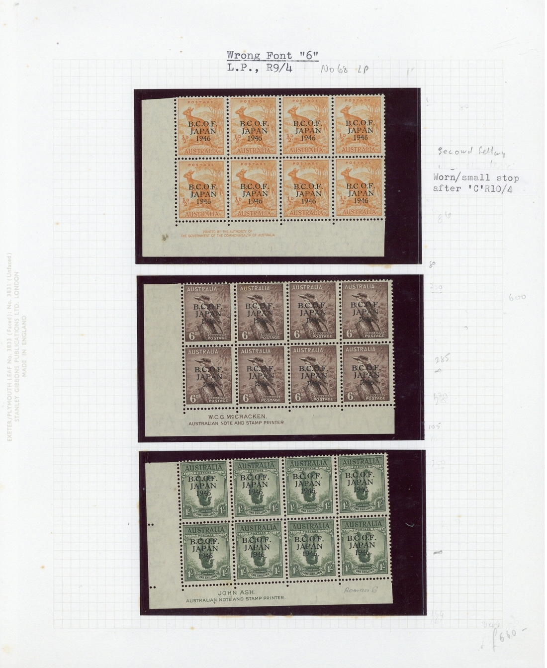 ½d., 6d. and 1/- each in a lower left corner imprint block of eight (4x2), the top right stamp in each showing wrong font "6", the 6d. and 1/- blocks both with a stamp with a small tone spot on reverse, otherwise fine mint. S.G. J1/a, J4/a, J5/a, £1246