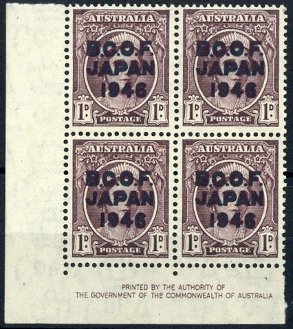 1d. brown-purple lower left corner block of four with imprint, variety blue-black overprint, fine unmounted mint. S.G. J2a, £240+; BW J2c/z, $750
