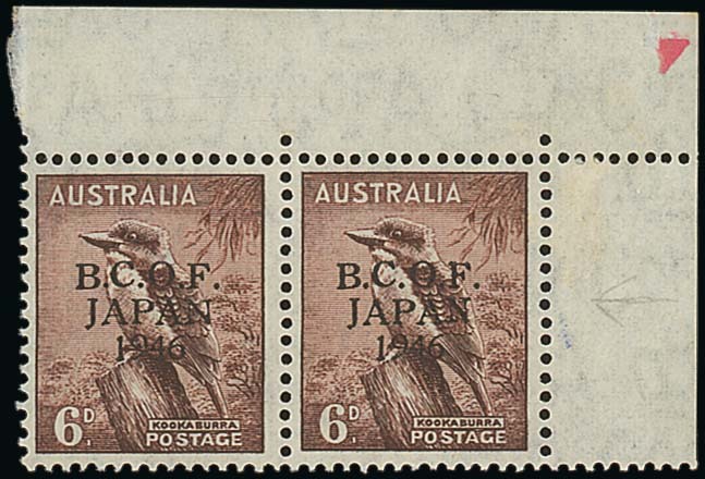 6d. purple-brown top right corner pair, the right stamp showing variety narrow "n", fine mint. S.G. J4/c, £300. Photo