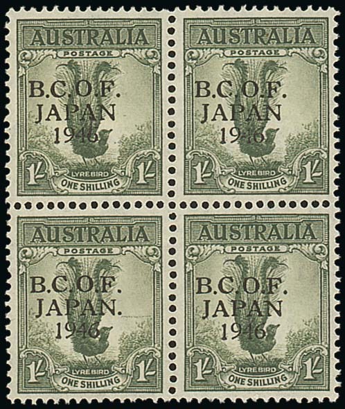 1/- grey-green block of four, the lower left stamp showing stop after "japan", fine unmounted mint. B.P.A. Certificate (1989). S.G. J5/b, £550+. Photo