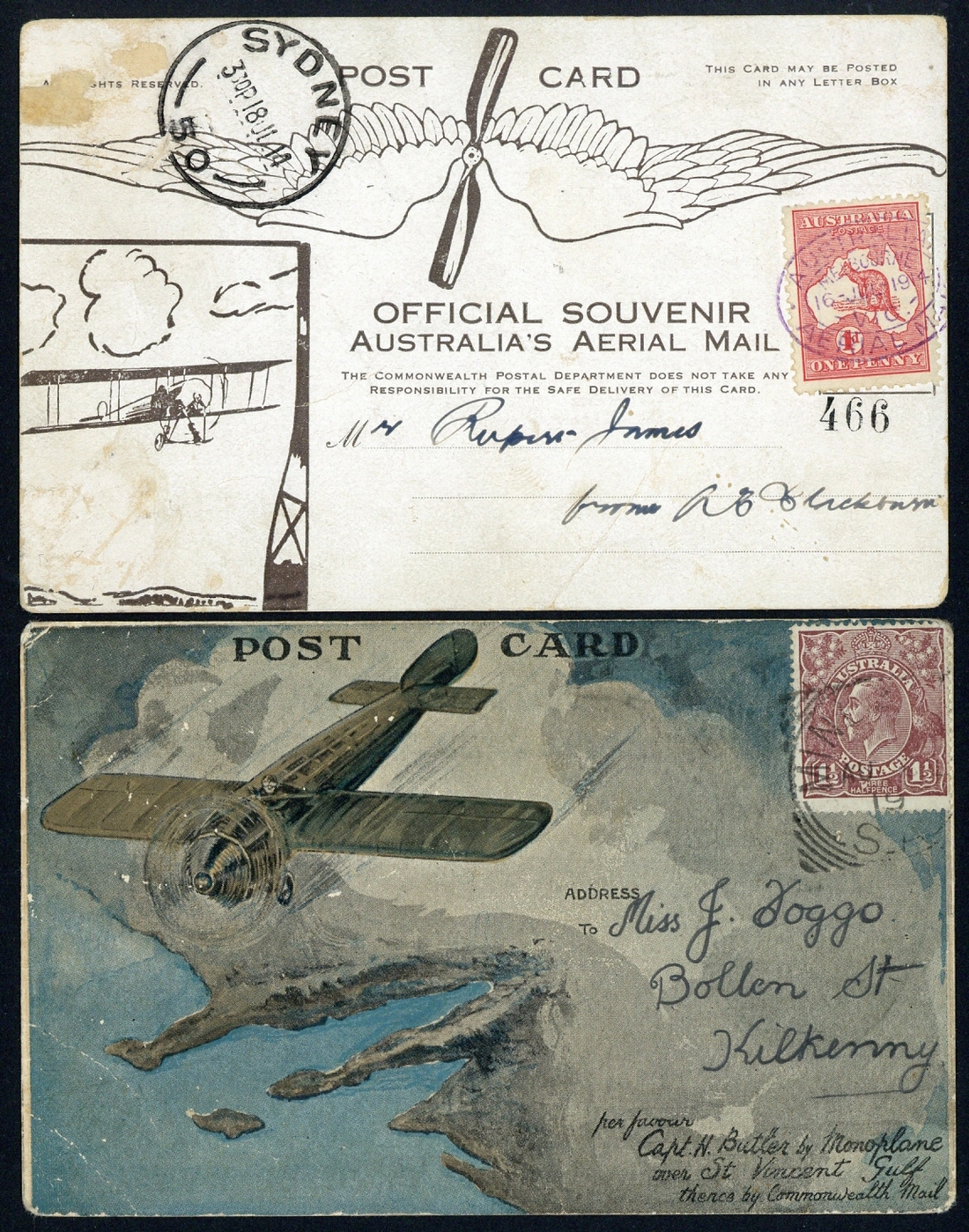 1914 (16 July) souvenir postcard flown from Melbourne to Sydney by Maurice Guillaux, bearing Kangaroo 1d. tied by violet oval cachet, some faults; and 1919 (6 Aug.) coloured souvenir postcard flown from Minlaton to Adelaide by Capt. Harry Butler, numbered "654" and with printed message and signature, a few small faults