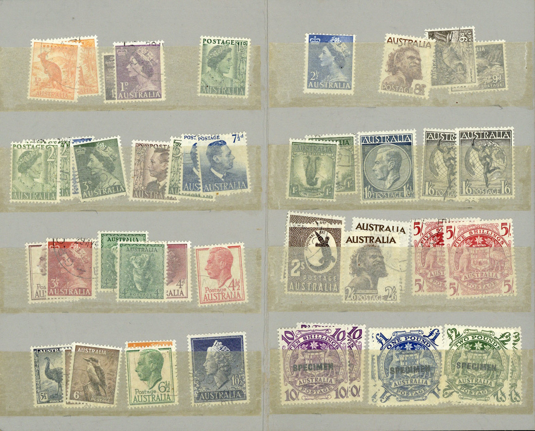 1913-50 mint and used accumulation housed in packets, envelopes, cigar boxes and on album leaves, contained in a carton, including used lower value Roos and KGV Heads in quantities, 1948-56 Arms set of three (2) overprinted "specimen". An interesting lot worthy of closer inspection. (thousands)