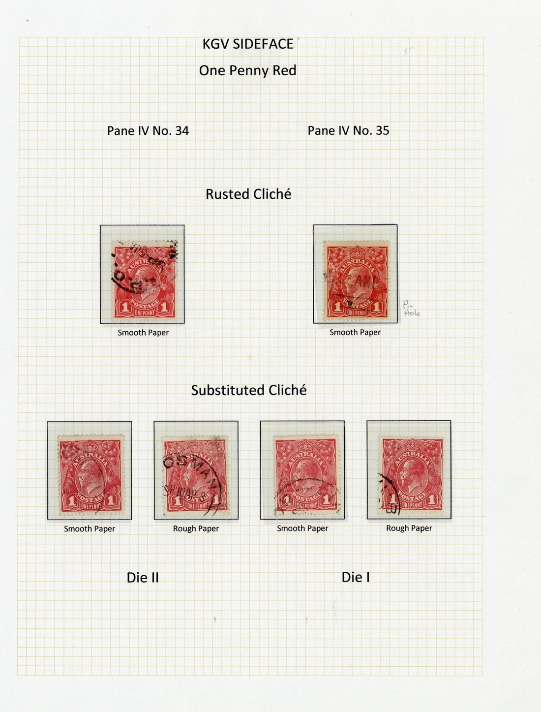 1914-20 1d. rusted cliché (right pane R6/4 and R6/5), the second with pinhole, 1d. Die II substituted cliché (2), 1916-18 1d. Die I substituted cliché (2), rough and smooth papers, used, good to fine. S.G. 21ca, 21cb, 47ba, £1,170