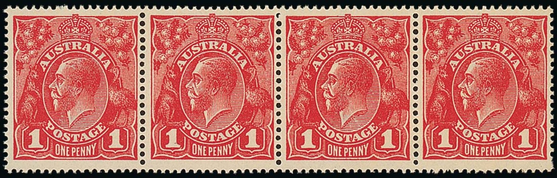 1918-18 unsurfaced paper 1d. rose-red, horizontal strip of four, the first pair Die II, original gum, fine. S.G. 47b, 47i., £970+. Photo