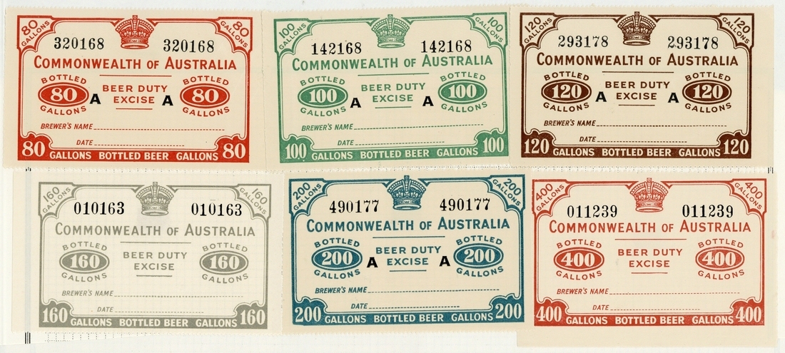 1947 Beer in Casks 2 gallons to 52 gallons set of eight, 1947 C of A Beer in Bottles 2 gallons to 24 gallons set of four and 1948 Beer in Bottles 2 gallons to 400 gallons (14 values), fresh and fine mint