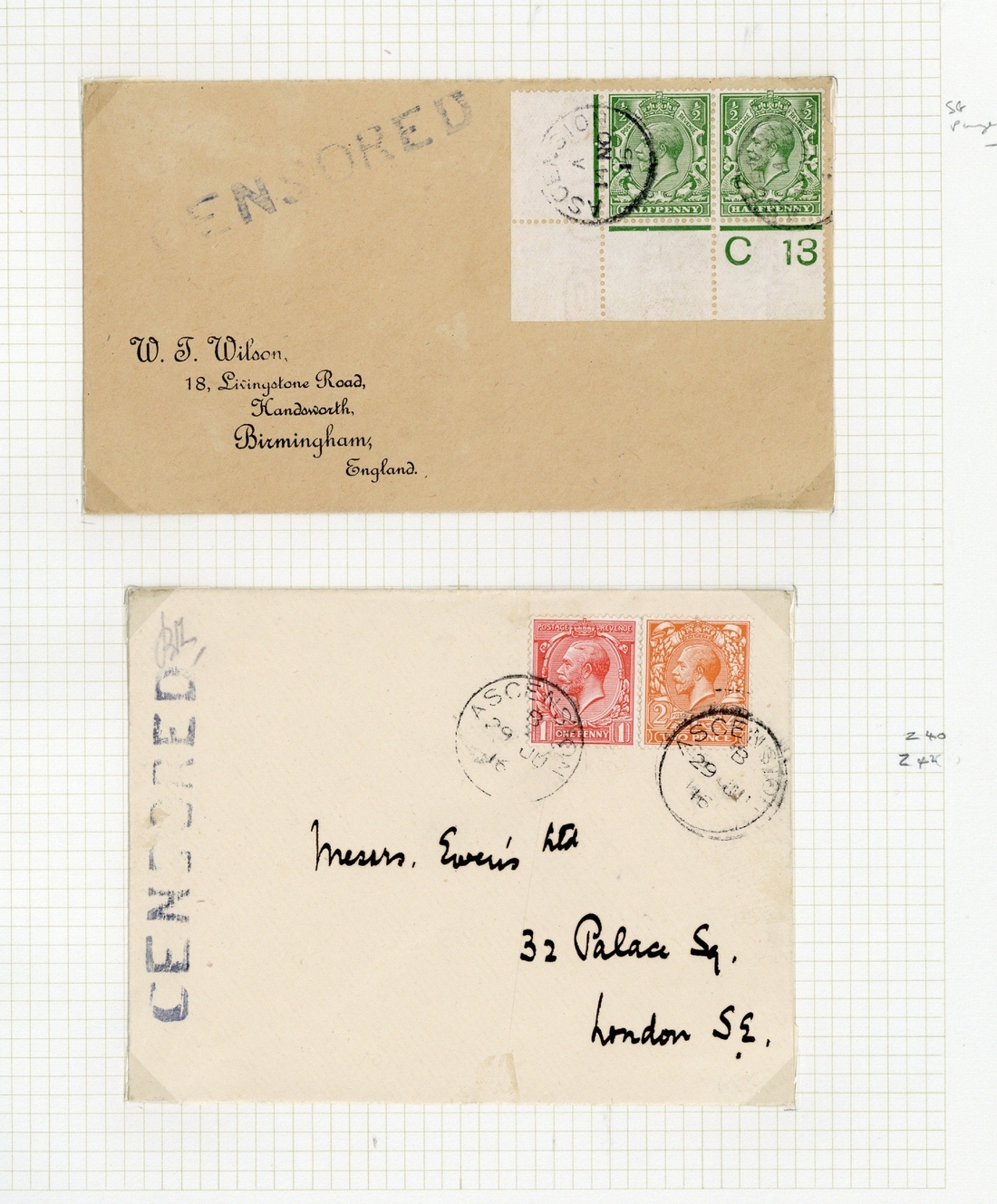 Great Britain used in Ascension selection (14), including Edward ½d. pair indistinctly cancelled on p.p.c. (Devil's Ash Pit) to Cape Town, 1d. (2, one on piece), 1911-12 ½d. on piece, 1912-22 ½d. Control pair on censored "Wilson" cover, 1d. and 2d. on censored cover to London, values to 3d., etc., chiefly fine