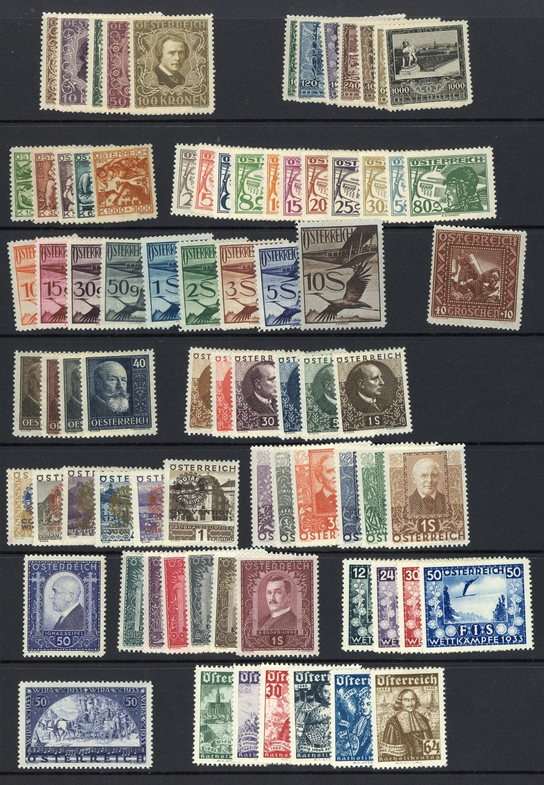 1922-57 mint selection (250) on stockpages, including 1922 Musicians, 1923 Artists, 1924 Artists, 1925-30 Air, 1928 Republic, 1930 Anti T-B, 1931 Rotary, 1931 Writers, 1932 Seipel, 1932 Painters, 1933 F.I.S., 1933 Ordinary paper WIPA 50g. (+ 50g.), 1933 Catholic Congress, 1934-36 3s., 5s., 1934 Architects, 1935 Heroes, 1936 F.I.S., 1936 Inventors, 1937 Doctors, 1948-52 Costumes 1s. claret, 1948 Artists, 1949 Children, 1949 Prisoners of war, 1949 U.P.U., 1949 Millöcker, 1950 Hofer, 1950 Plebiscite, 1950 Air Birds, 1951 Reconstruction, 1952 Olympics, 1952 Stamp Day, 1952 Children, 1955 Republic, etc., part original gum, chiefly fine