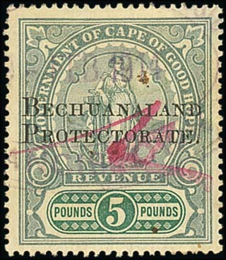 revenue; 1913 on Cape Hope Standing, £5 green and green cancelled by 1914 oval datestamp in violet and red ink mark; two tiny surface blemishes, otherwise sound. Scarce. Barefoot. 28, £250
