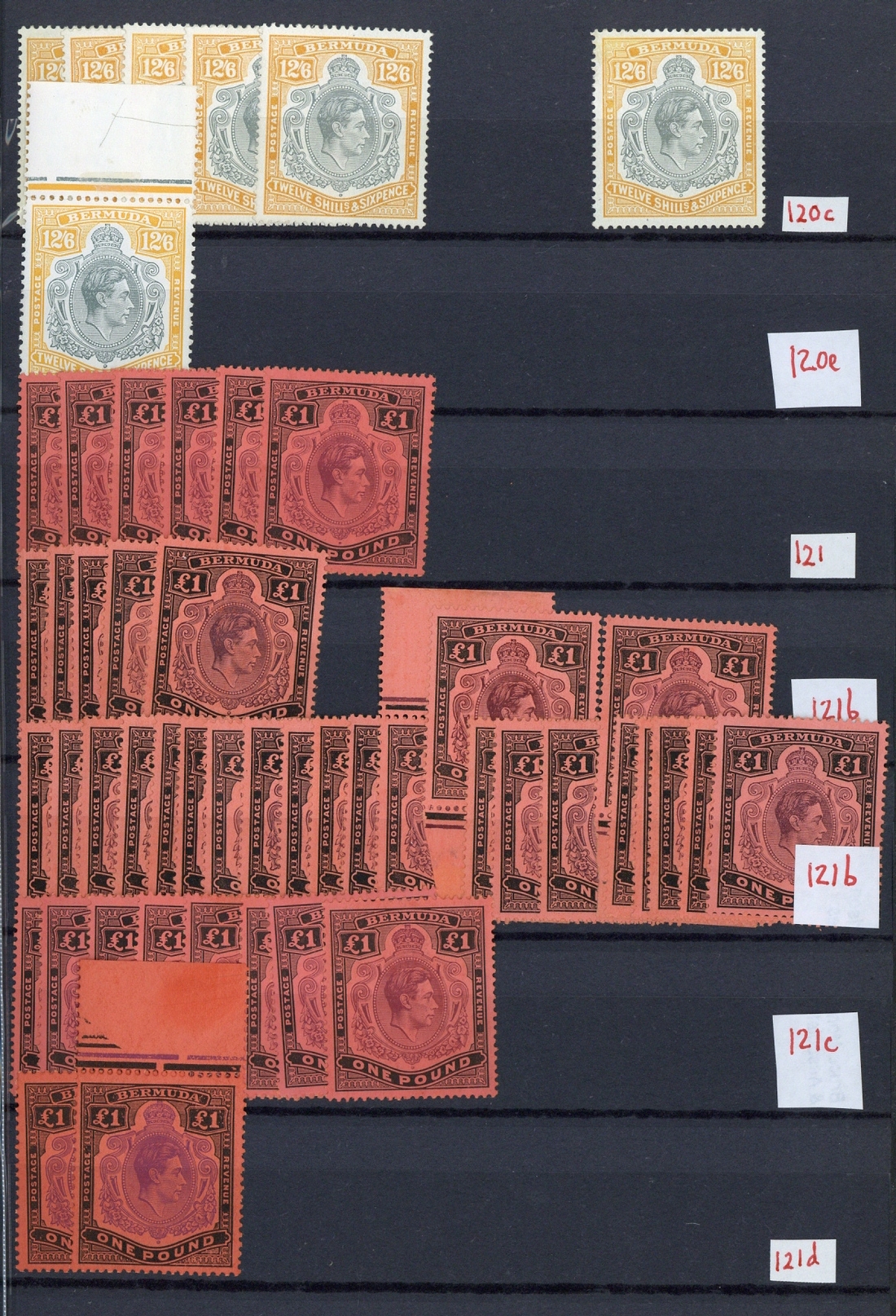 1938-53 2/- to £1, mint and used specialised selection (370+) housed in a red stockbook, including perf. 14 comb 2/- deep purple and ultramarine on grey blue (8 mint, 2 used), deep reddish purple and ultramarine on grey-blue (7 mint), 2/6d. black and red on grey-blue (17 mint), 5/- green and red on yellow (11 mint), 10/- green and deep lake on pale emerald (10), 10/- bluish green and deep red on green (19 mint), 12/6d. deep grey and brownish orange (mint and used), £1 purple and black on red (6 mint), £1 pale purple and black on pale red (27 mint), etc., many identified plate flaws, blocks, etc., chiefly fine and with a full list included. S.G. 166-121e, £27,962+