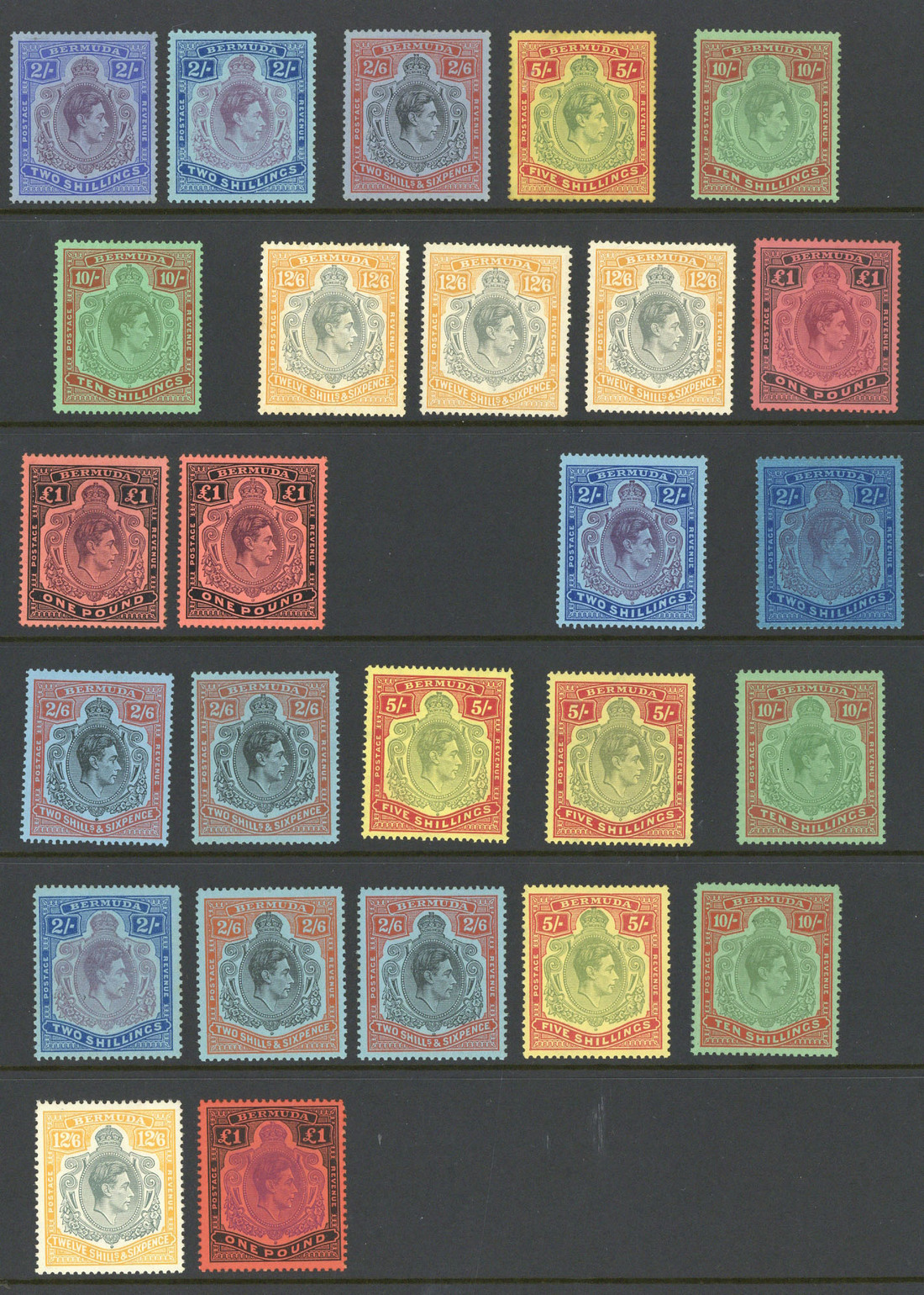 1938-53 mint selection comprising, perf. 14, chalky paper, 2/- (2), 2/6d., 5/- (no gum), 10/- (2), 12/6d. (3), £1 (3), ordinary paper, 2/- (2), 2/6d. (2), 5/- (2), 10/-, and, perf. 13, 2/-, 2/6d. (2), 5/-, 10/-, 12/6d. and £1. Generally good to fine