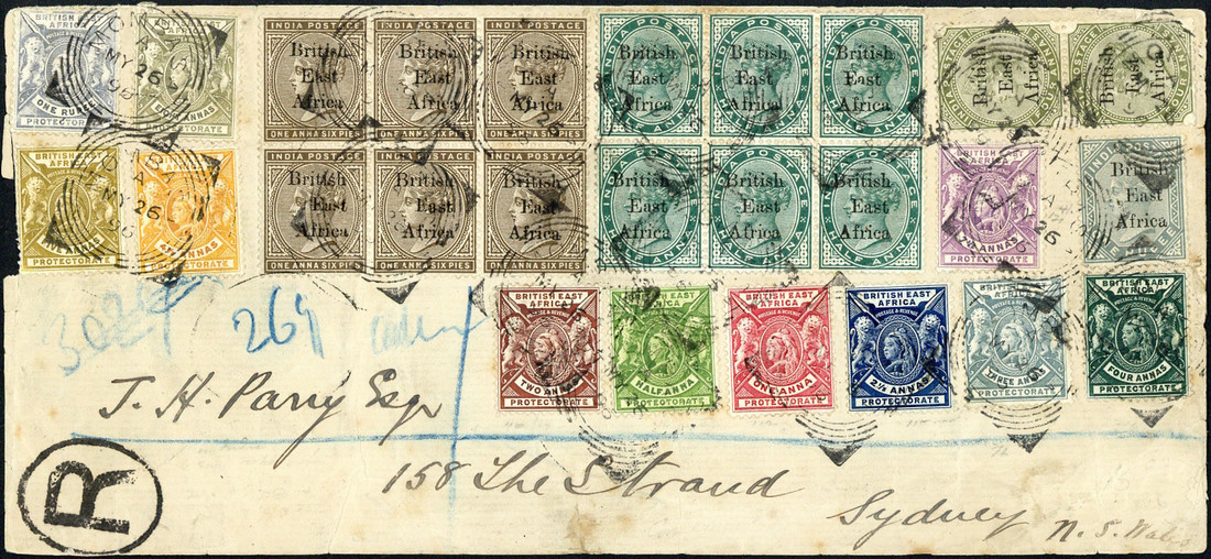 1896 (26 May) envelope (220x100mm.) registered from Mombasa to Sydney, bearing 1895-96 on India ½a. and 1½a. blocks of six (both 3x2), 4a. vertical pair, 1r. slate and 1896-1901 ½a. to 1r. (11 values), a total of 5r.9½a., all neatly cancelled by squared-circle datestamps and with oval-framed "R" at lower left corner, the reverse with Aden (2.6) and arrival (4.7) datestamps; the envelope with small edge imperfections though a spectacular and colourful franking