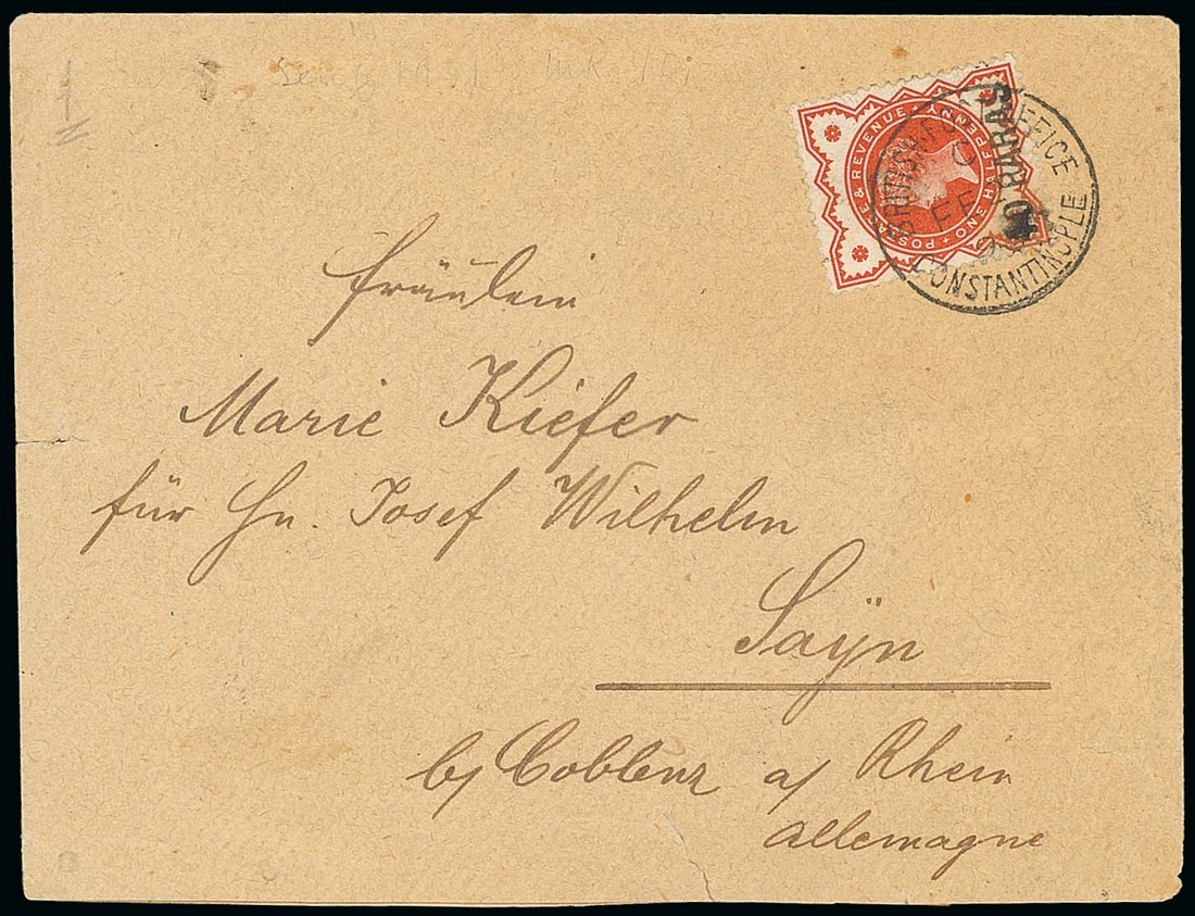 1893 (27 Feb.) envelope from Constantinople to Germany, bearing 1893 (25 Feb.) "40 paras" on ½d. vermilion neatly cancelled by c.d.s. with arrival c.d.s. (3.3) on reverse. B.P.A. Certificate (2011). Photo