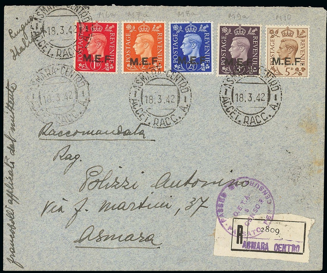 1942 (18 Mar.) envelope registered from Asmara and addressed locally, bearing 1942 (2 May) Type M1 5d. and Type M2a 1d., 2d., 2½d. and 3d. cancelled by "asmara centro" double-ring datestamps and with handstamped registration label tied by bi-lingual censor cachet in violet, transit (18.3) and arrival (19.3) c.d.s. on reverse. B.P.A. Certificate (2010). Photo