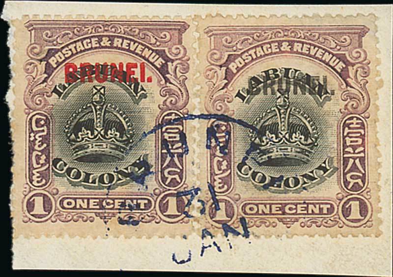 1906 (1 Oct.) on Labuan 1c. black and purple, two examples, one with error overprint in black, tied by blue Brunei c.d.s. on small piece (D. Field circular h.s. in violet on reverse); some very minor soiling around perfs otherwise fine. Very rare. B.P.A. Certificate (2015). S.G. 11, 11a; £3000+. Photo