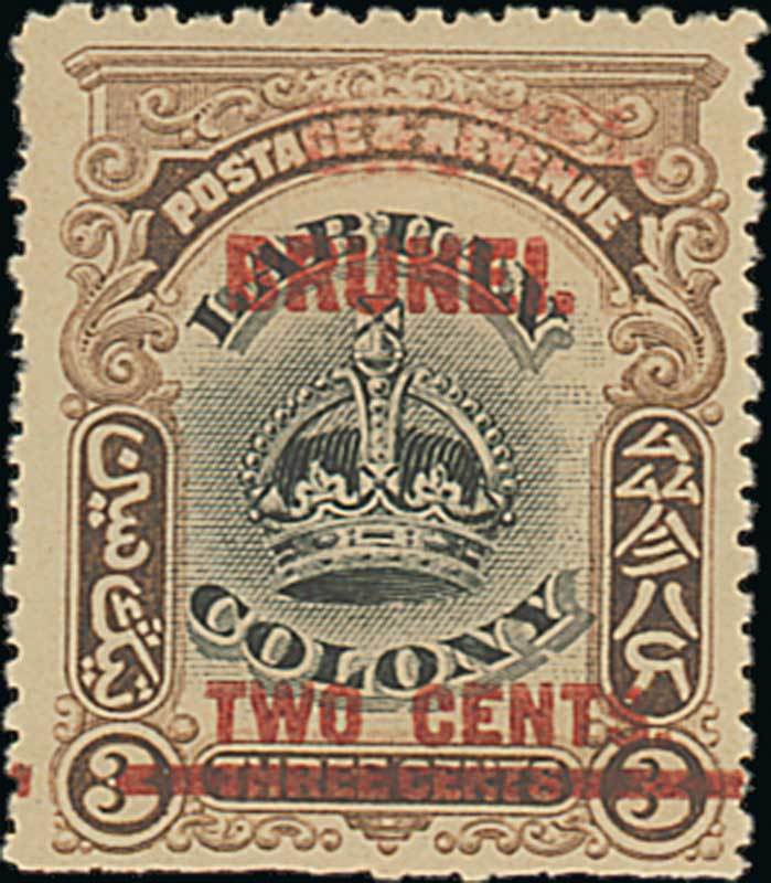1906 (1 Oct.) on Labuan 2c. on 3c. black and sepia, variety "brunei" double (officially partially erased), unused without gum, perfs clipped at foot otherwise fine. Rare. B.P.A. Certificate (1985). S.G. 12a, £3750. Photo