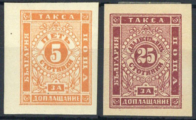 1885 Postage Due imperforate 5st. orange and 25st. brown lake, large part original gum, fine. S.G. D50-51, £1,350. Photo