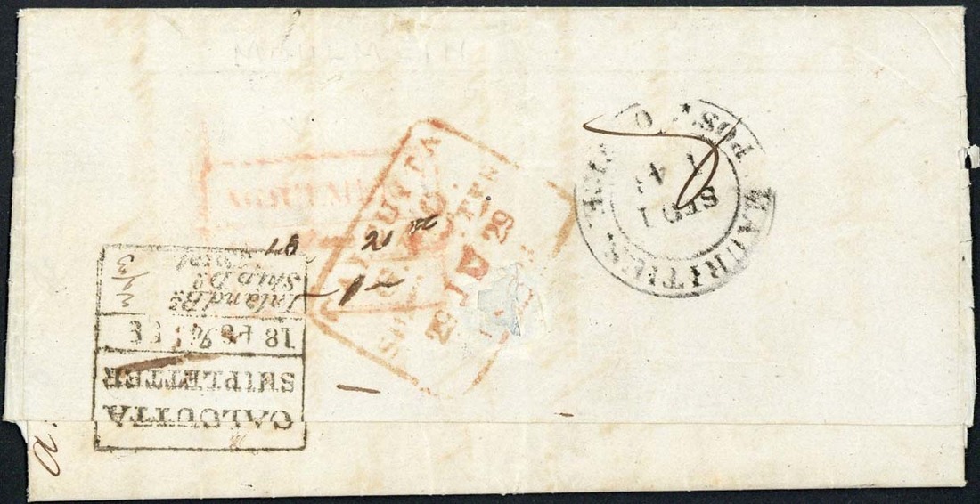 1848 (18 June) entire letter ex the "Pipon Bell" correspondence from Moulmein to Mauritius showing, on reverse, framed "moulmein/Paid" d.s. in red (Type PS3) overstruck by two different Calcutta Ship Letter transit d.s. with "mauritius/post office" double-ring arrival d.s. (1.9) alongside; the face panel with large portion excised