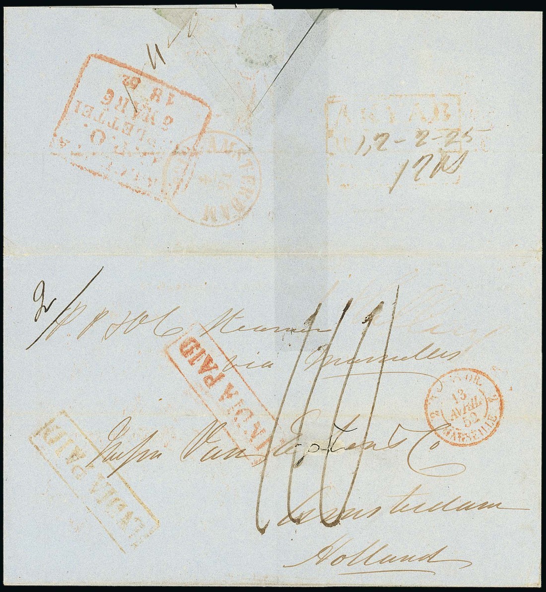 1852 (24 Feb.) entire to Amsterdam, marked "Via Marseilles", rated "1/10", showing framed "india paid" and Marseilles entry d.s. (13.4) with, on reverse, framed "akyab/Paid" (Type PS5) with manuscript "12as" inserted, Calcutta Ship Letter transit d.s. (6.3) and arrival c.d.s. (15.4), all struck in red. The entire opens out well for display. Photo