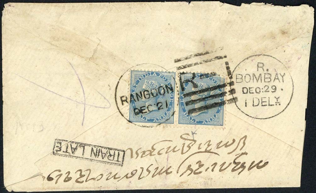 Undated envelope to Bombay bearing, on reverse, ½a. blue pair tied by fine "rangoon/r-1" with framed "too late" and arrival c.d.s. (29.12) alongside; the envelope truncated at right, and 1874 (4 June) envelope to Calcutta bearing, on reverse, 1a. brown tied by fine "rangoon/r-1" and showing arrival Steamer Letter datestamp (9.7)