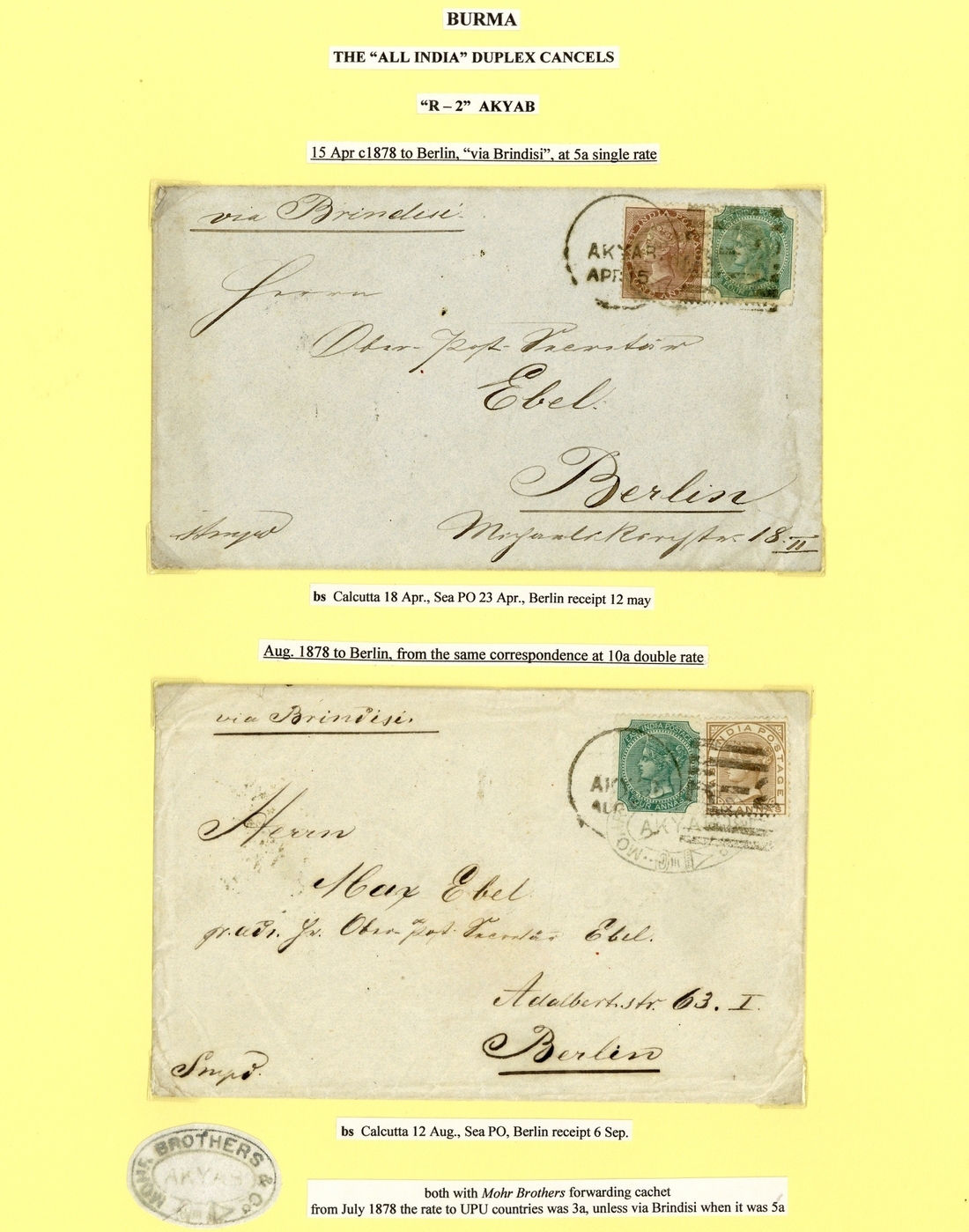 1878 c. (15 Apr.) and 1878 (Aug.) envelopes from the same correspondence to Berlin and marked "via Brindisi", the former bearing De La Rue 1a. brown and 4a. green, the latter a double rate with 4a. green and 6a. brown, all with firm's chop and tied by "akyab/r-2" and showing, on reverse, Calcutta, Sea Post Office and arrival datestamps; both a fraction soiled