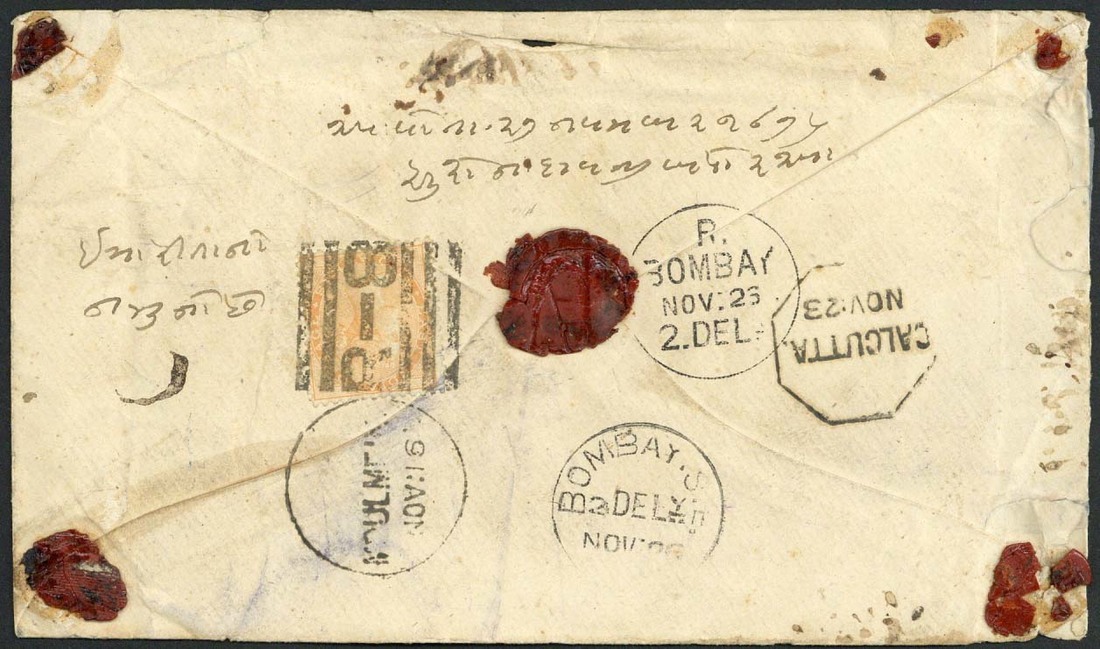 1878 c. (16 Nov.) envelope (small faults) to Bombay bearing, on reverse, De La Rue 2a. orange clearly tied by "moulmein/r-8" and showing Calcutta and arrival datestamps alongside