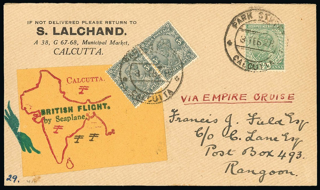 1928 (3 Feb.) Empire Cruise by Cave-Brown-Cave, envelope from Calcutta to Rangoon with special flight label and bearing 3p. pair and ½a. Photo