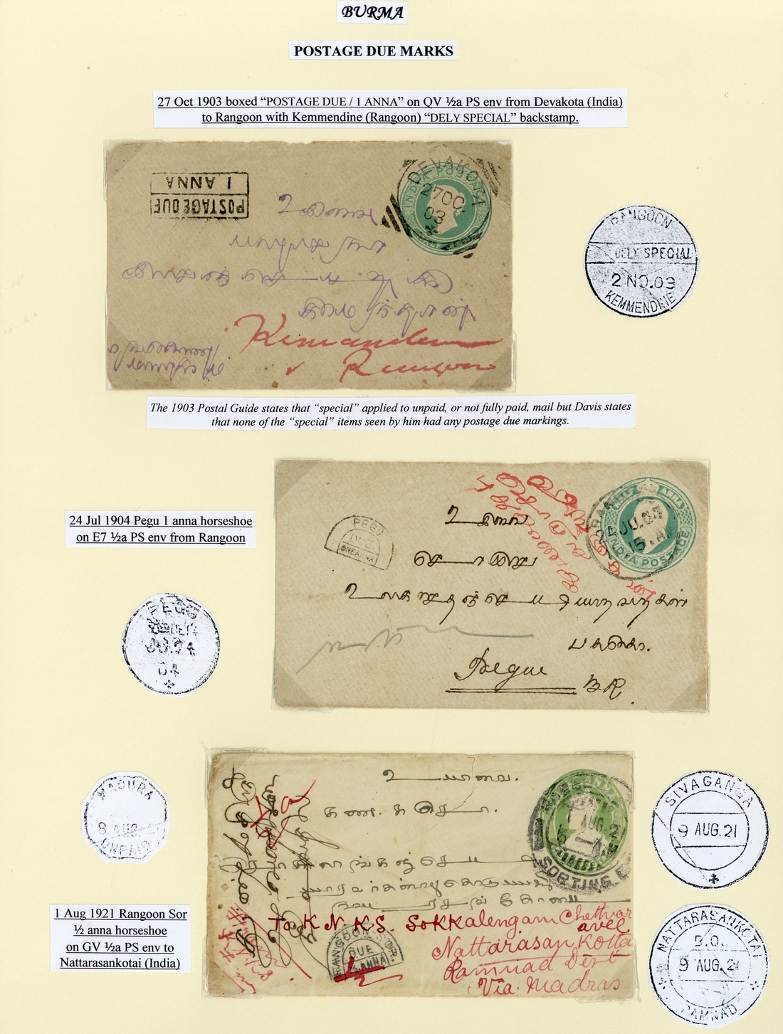 1903-21 stationery envelopes showing Postage Due markings comprising framed "postage due/1 anna" of Rangoon and horseshoe types for Pegu and Rangoon Sor; 1931 (Mar.) envelope from England to Rangoon and 1938 (Feb.) envelope from India to Rangoon, both showing arrival Dead Letter Office datestamps; and 1935 (Dec.) envelope from Rangoon to Vladivostok showing large "retour parti" h.s.; 1905 (30 June) envelope from Rangoon to Madura, marked "Book Post", bearing 1898 "¼" on ½a. pair, and 1922 (19 Jan.) envelope registered from Rangoon to Madura and bearing, on reverse, 1911 1a. (2) and 1921 9p. on 1a.; both covers with small faults. Scarce usages of the surcharged stamps in Burma; 1907-09 Telegrams (13) from Maymyo to Rangoon Cantonment (2) and vice versa, Rangoon to Maymyo (6), Toungoo to Maymyo, Yamethin to Maymyo (2) and to Rangoon; 1927-37 envelopes (4) and stationery registered envelopes (3), all registered, variously addressed and franked with items from Gyobingauk, Nattalin/Prome (2), Rangoon (2), Tavoy and Yenangyaug; 1929-35 envelopes (10), stationery card and envelopes (5) and a picture postcard, variously addressed and franked, all with slogan cancels