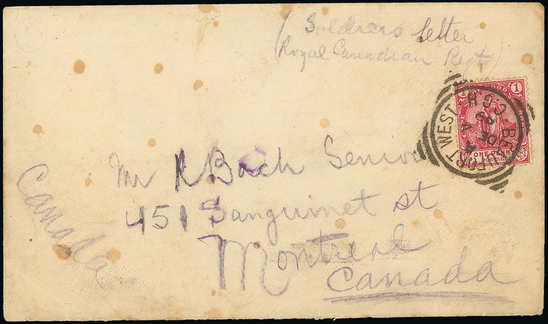 1899 (4 Dec.) Canadian Contingent "Maple Leaf" crested envelope (a few fox marks) from R.C. Bach of "E" Company at Beaufort West to Montreal, marked "Soldiers Letter, Royal Canadian Regt." and bearing Cape 1d. cancelled by squared-circle datestamp, Montreal c.d.s. (7.1) on reverse. Photo