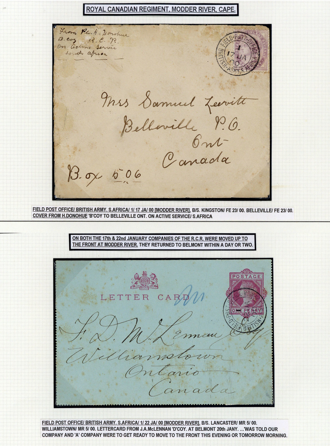 1900 (Jan.) pair of items from Modder River, comprising 17 Jan. envelope from H. Donohue of "B" Company to Belleville bearing 1d. lilac and 22 January 1d. letter card from J.A. McLennan of "D" Company to Williamstown, both cancelled by F.P.O. 1 c.d.s. and a further 1d. letter card from McLennan on 7 February cancelled by F.P.O. c.d.s. when back at Belmont Camp